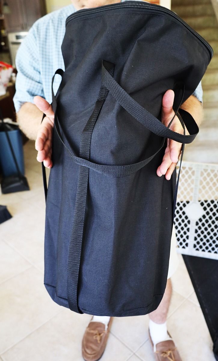 If you have the optional tub cover, it stows at the bottom of the bag, and the freezer with the motor attached sits on top. Use a strip of cardboard or another material to wrap the tub cover, protecting the tub ears that stick out on each side. They are narrow and sharp and will likely poke through the canvas over time if they are left unprotected. A short length of poly or rubber tubing slid over the ears will also protect them and the bag.