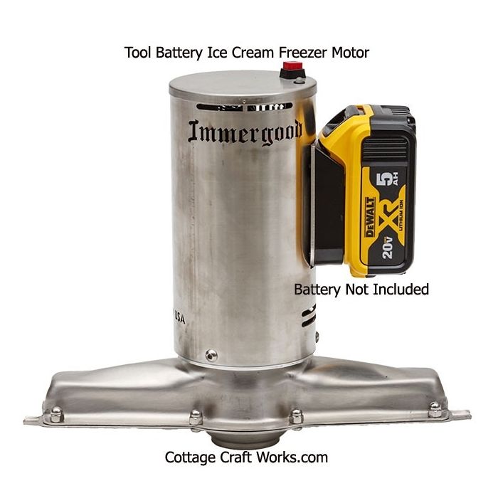 USA-made, decisive, triple-action, stainless-steel, battery-powered DC motor uses popular Dewalt, Makita, or Milwaukee tool battery packs. (Not Included) The perfect ice cream machine-maker motor for off-grid, camping, and remote cabins.