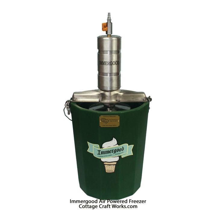 Powered by a 10 CFM air motor (operating at ~50 PSI), this model is ideal for off-grid kitchens, commercial hobbyists, and anyone who wants consistent performance without electrical dependence. Whether you’re making small batches for family gatherings or experimenting with custom flavors, the Immergood freezer delivers professional-grade texture and performance.